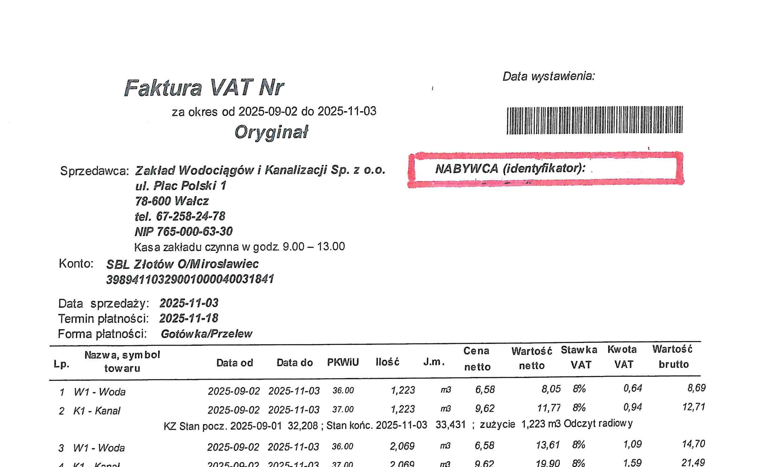 W przypadku kontaktu telefonicznego lub osobistego w siedzibie Spółki odnośnie uzyskania wszelkich informacji związanych z podpisaną umową na dostarczanie wody i odprowadzanie ścieków, wystawionych faktur oraz należności prosimy o podawanie numeru nabywcy (identyfikatora), który znajduje się na fakturze.